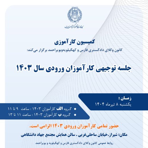 جلسه توجیهی کارآموزان وکالت ورودی سال ۱۴۰۳ کانون وکلای دادگستری فارس و کهگیلویه و بویراحمد روز یکشنبه مورخ ۱۴۰۴/۴/۸ از ساعت ۹ تا ۱۳ برگزار می گردد.