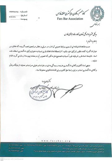 نامه رییس کانون به مدیر کل اداره کار ، تعاون و رفاه اجتماعی استان فارساخبار۱۰ مهر ۱۴۰۴نویسنده سایت به اشتراک بگذارید نویسنده سایت مقالات: 432 نوشته قبلی گزارش بیست و هفتمین جلسه هیات مدیره دوره ۳۴ نوشته بعدی چرا مدیران نهاد وکالت نباید نقش اینفلوئنسرها را بازی کنند؟ دیدگاه ارسال کنیدلغو پاسخنشانی ایمیل شما منتشر نخواهد شد. بخشهای موردنیاز علامتگذاری شدهاند * نام * پست الکترونیک * سایت اینترنتی اضافه کردن نظر برای دفعه بعد که نظر می دهم نام، ایمیل و وب سایت من را در این مرورگر ذخیره کنید.فرستادن دیدگاه